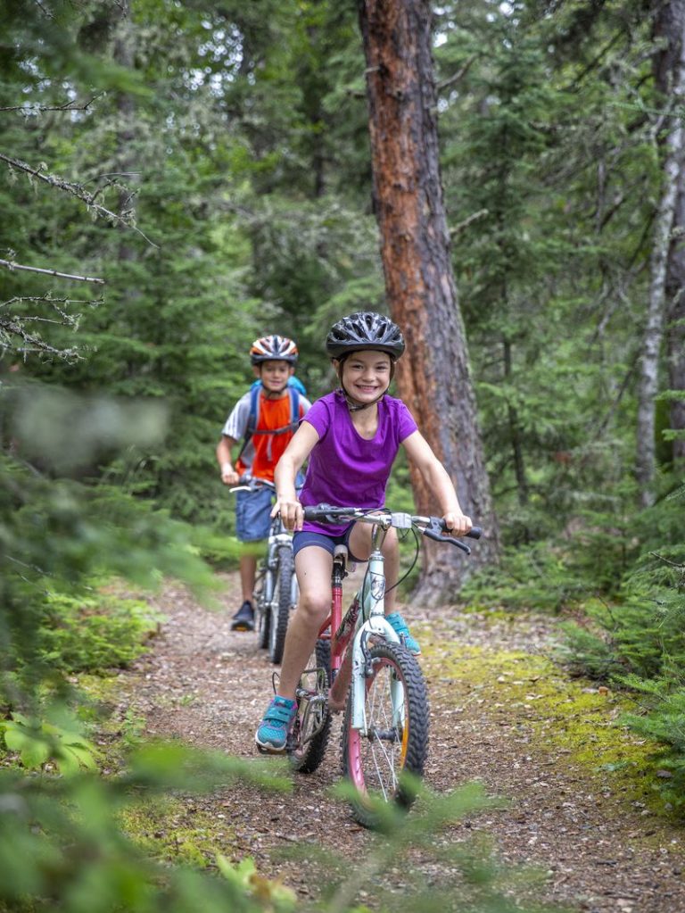 Des enfants font du vélo sur un sentier du terrain de camping Narrows, près du lac Waskesiu, pendant l’été, au parc national de Prince Albert. / Children bike along on a trail at the Narrows Campground beside Waskesiu Lake during the summer in Prince Albert National Park.